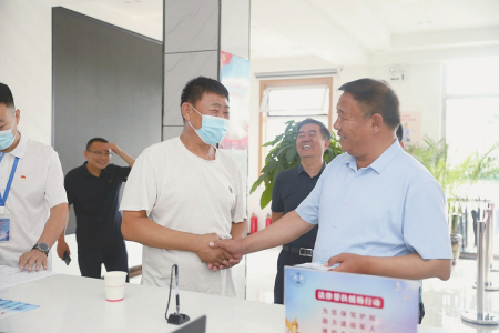 五十五岁的退役军人李师傅因劳动纠纷到大同市退役军人法律援助中心寻求帮助,在询问详细情况后,同为军人出身的省司法厅二级巡视员张锁发(右)亲切握住李师傅的手说:“法援中心一定会尽全力帮助你,别担心。”